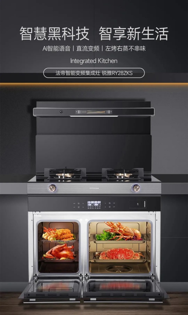 法帝銳雅RY28ZKS獨立蒸烤變頻集成灶,下方自帶大容量蒸箱和烤箱,可謂是海納百川,可以一次性放置四層蒸烤架,同時蒸、烤/炸,互不串味,滿足大家庭的飲食所需,過節(jié)聚會也能輕松hold?。?/span>