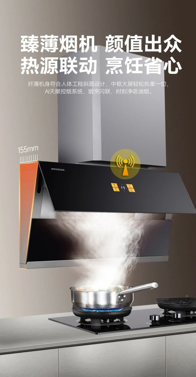 超薄吸油煙機(jī),寬域鎖煙,杜絕油煙逃逸。配置直流變頻風(fēng)機(jī),NVH多維柔聲科技超凈吸,智能巡航增壓實時感應(yīng)風(fēng)阻,自適風(fēng)量檔位為烹飪保駕護(hù)航,油煙強(qiáng)勢暢排不倒灌。吸凈+暢排+防倒灌三管齊下,還廚房一方清新!