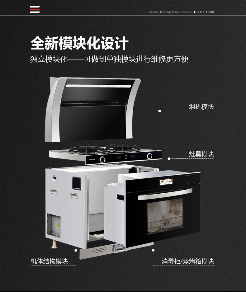 這里的“整”指的是集成灶的整機(jī),“零”在這里具體指以下四個(gè)方面:煙機(jī)模塊、灶具模塊、消毒柜/蒸烤箱模塊、機(jī)體結(jié)構(gòu)模塊。