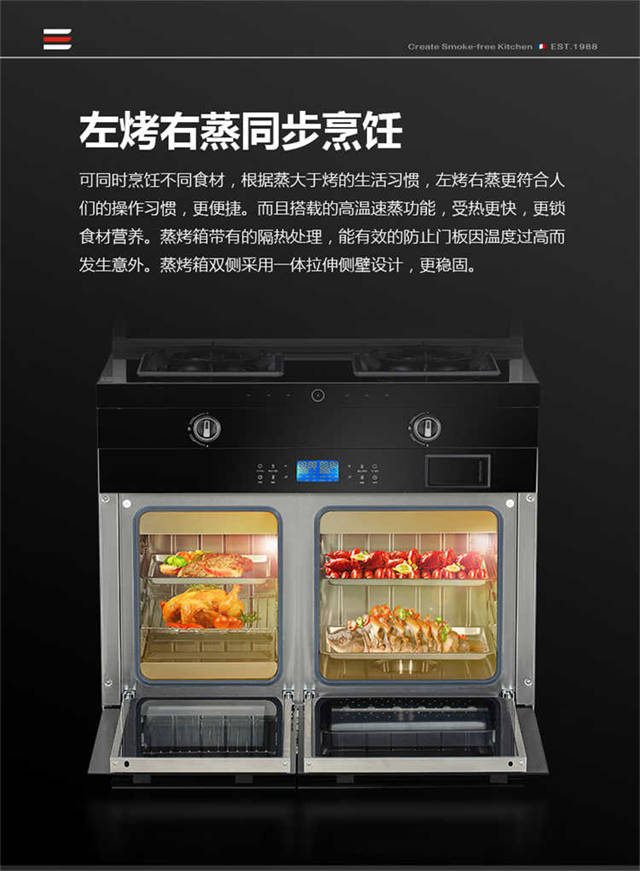 展現(xiàn)了灶具和煙機(jī)的風(fēng)采,接下來(lái)就該它的獨(dú)立蒸烤功能大展身手了。朗情獨(dú)立蒸烤集成灶根據(jù)普遍的蒸大于烤的操作習(xí)慣,采用左烤右蒸,符合人性化設(shè)計(jì)。