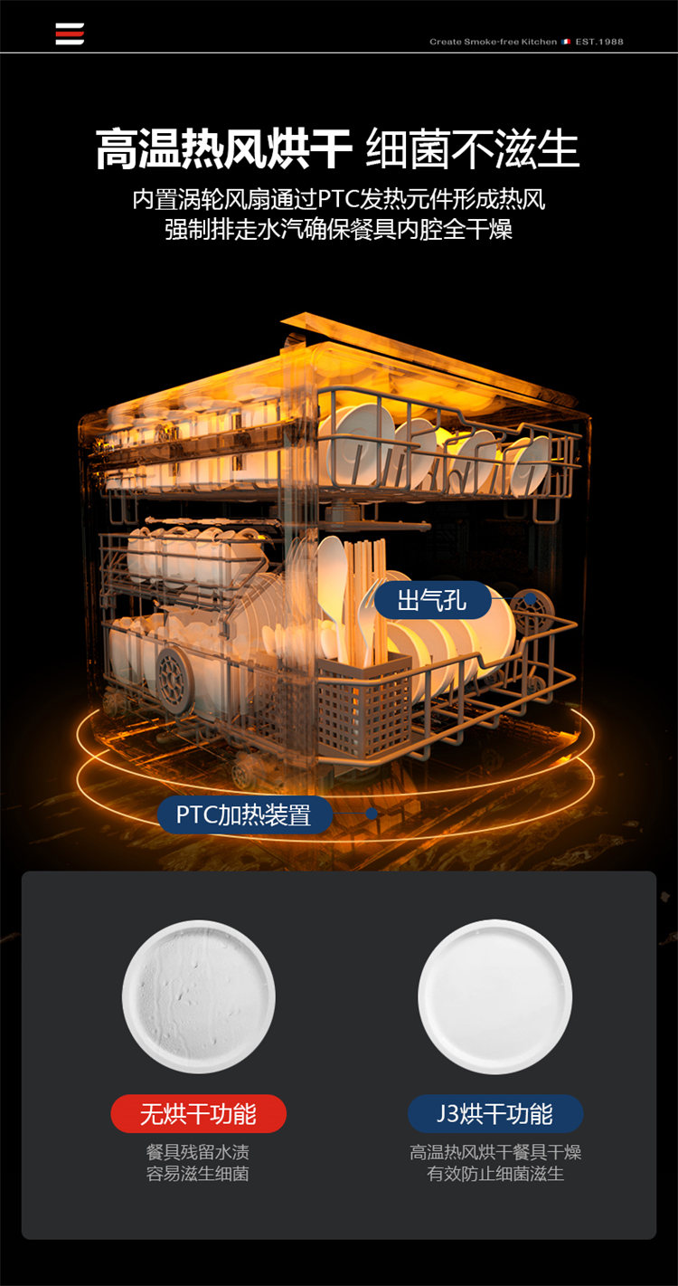 在潮濕的環(huán)境中,容易滋生霉菌。法帝J3集成水槽洗碗機(jī)配備PTC高溫?zé)犸L(fēng)烘干功能,持久保持碗筷干爽,有效減少細(xì)菌的滋生,防止餐具的二次污染。